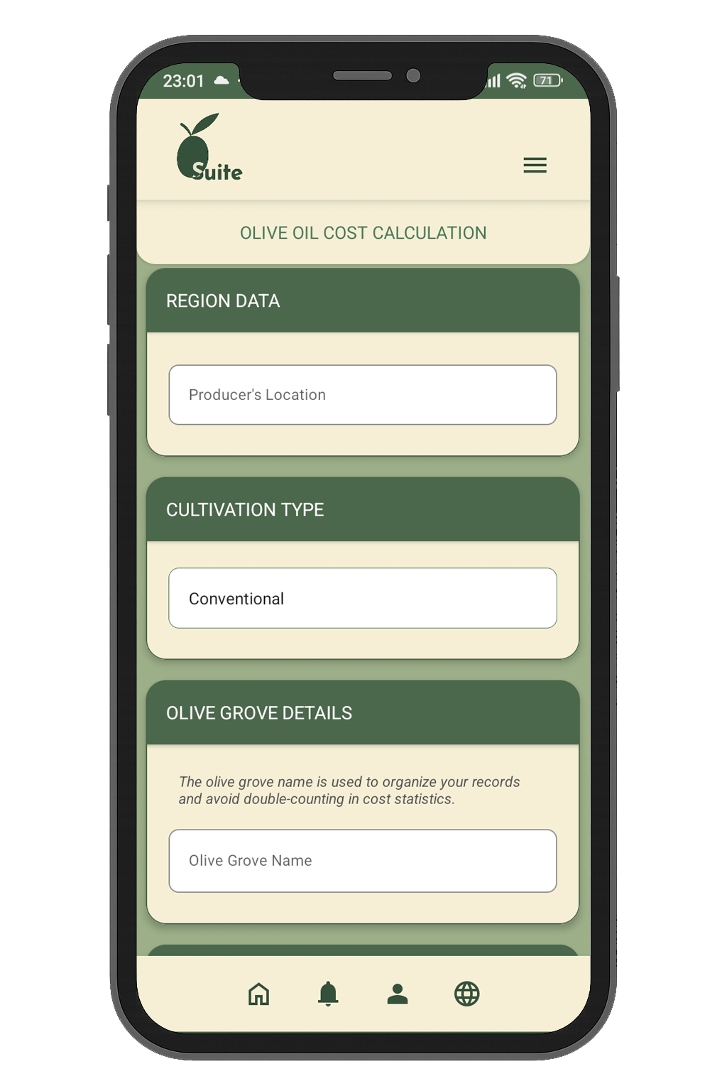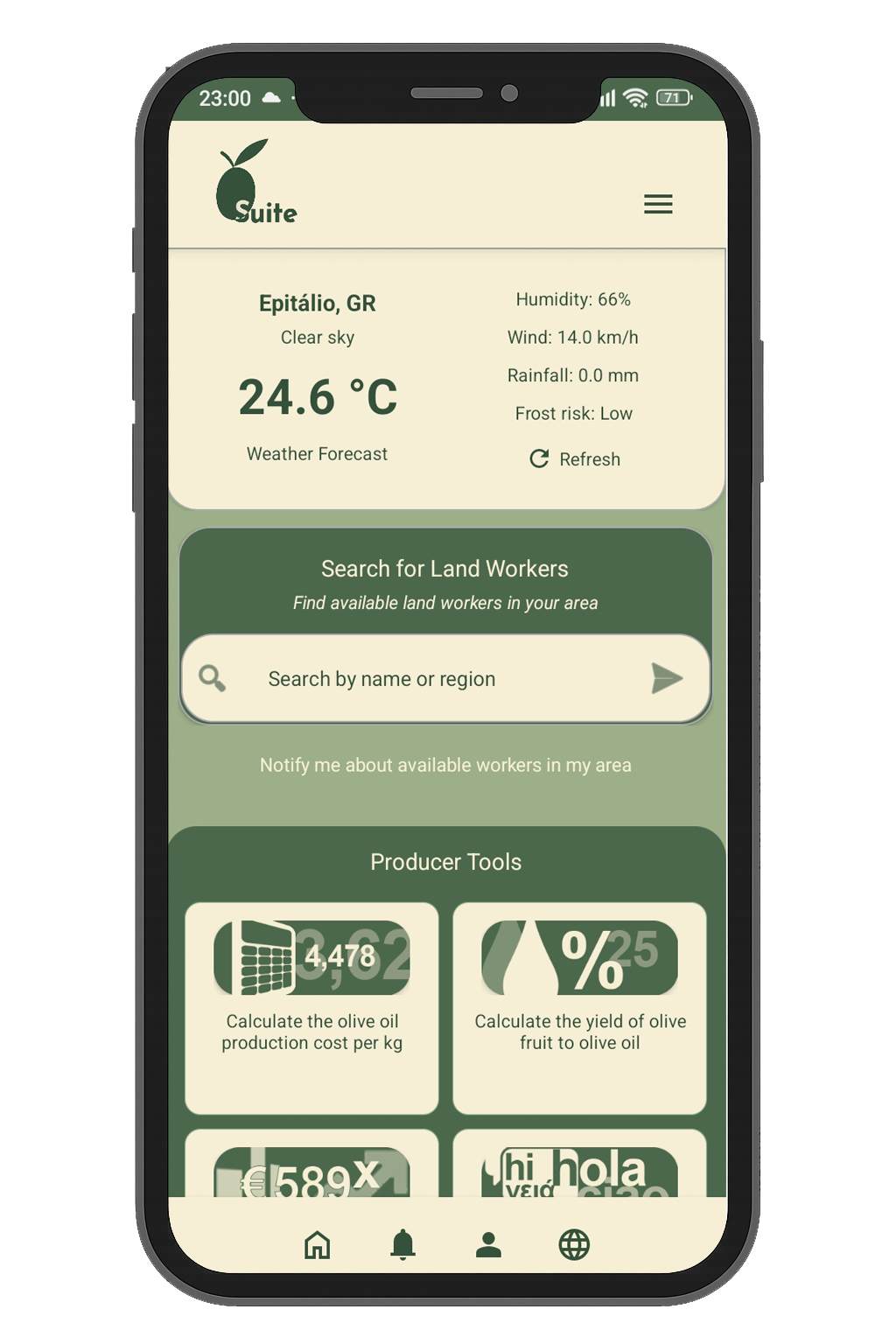 The Olive Suite app empowers olive oil producers with tools for cost and yield tracking, regional and global stats, weather forecasts, farmworker access, live chat, collaborations and market access to boost efficiency and profits. It supports 4 languages (English, Spanish, Italian, Greek). It was created to meet the genuine needs of producers for transparent information, helping them avoid misinformation and market manipulation.